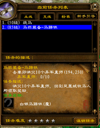 去南郊杀10个异军蛊师(194,250),杀完找牧马人选择白银马蹄铁(三等属性),任务完成。