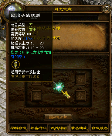 与欧冶子对话,获得白色的欧冶子的铁剑,包裹里面准备好一个天魔石(杂货店伙计处有卖),然后去找武器锻造师(383,337),选择“增加凹槽”,记住是选择欧冶子的铁剑进行增加凹槽,增加凹槽后,把铁剑放入月光宝盒,把定魂石(杂货店伙计处有卖)和一个可以镶嵌在武器的魂魄石也一起到到月光宝盒,点下面的按钮就完成镶嵌了,然后把镶嵌好的铁剑放回包裹,然后与欧冶子对话,获得五个一等定魂石,五个一等天魔石,任务完成。 &S5u(?9d:G4k%t6B7\