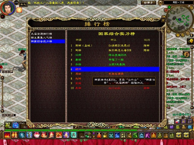 进攻方:燕,个人榜前100名56个。世界前10帮会1个,占领总舵帮会3个。其盟友齐赵分别还占有一个总舵。拥有绝对优势的大号,小号数量仅次于楚。