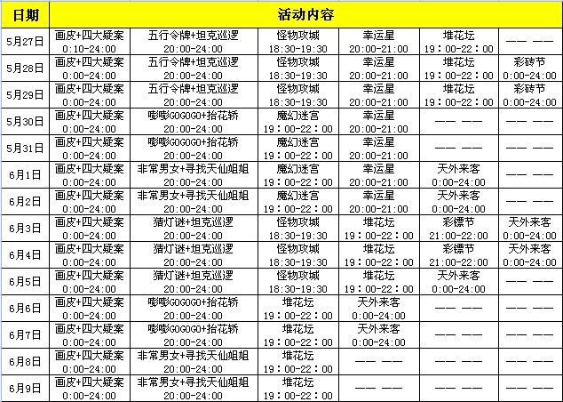 活动时间:5月27日-5月29日和6月3日-6月5日 每天20:00-24:00