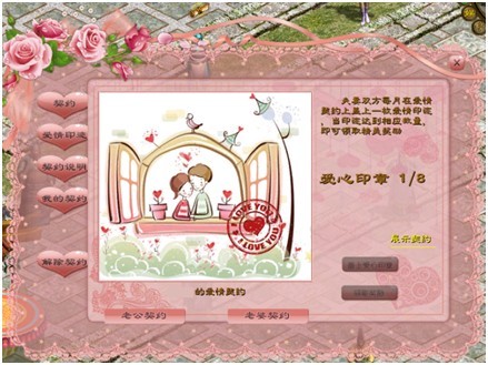 签署了“爱情契约”之后,玩家在接下来的8个月中,根据签署“爱情契约”的种类,夫妻双方的任何一方,只要每月在NPC“民政官”处领取了“爱情印迹”,夫妻双方就可在“民政官”处领取对应“爱情契约”中的丰厚奖励!第1次领取“爱情印迹”时,还有额外的不绑定的“个人界面”相送哦!在领取3次、5次和8次“爱情印迹”夫妻双方都可获得爱情契约的神秘大奖:“爱情宝典”。打开就有机会获得稀有个人装扮“白色爱恋”、“和风旭日”、“绿色心情”、“花瓣魅惑”和珍贵“永久恭福熊猫马牌”!