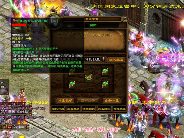 “无暇宝石升绿色装备不掉星”也是“免费洗点”时的一个重要活动。诸如“战旗”、“盾牌”、“马匹装备”等装备,就应该在这个时候升到绿15。