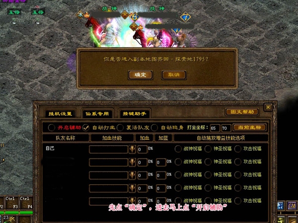 笔者的落位是这样安排的:队长开门后,所有号点确定,进3后点“开启辅助”,进号顺序是3——4——5——1——2号。马上切回3号(刺客),3号抵达(65 70)后马上隐身,然后切4号(打手仙),4号隐身,这样5号(打手法师)打手就能自然落位了。