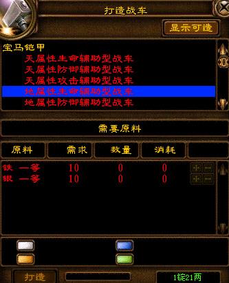 相信这个界面大家都很熟悉吧,如同打造装备那样选择所需类型,并准备相应材料进行战车打造。也如同装备那样,使用材料等级越高出现的战车属性也就越好。