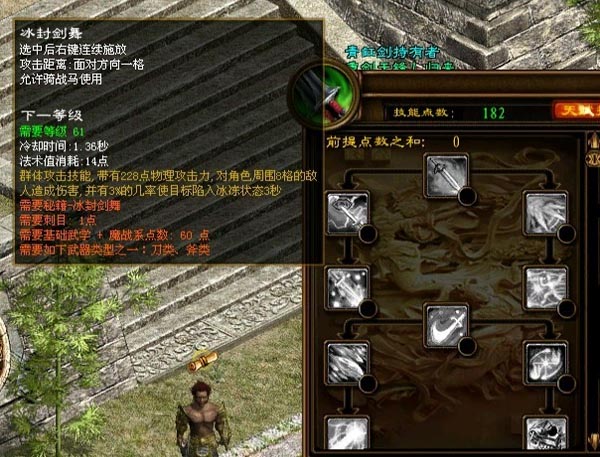 史上最炫最华丽的群攻技能就是他了,“冰封剑舞”迄今为止还被众多刷怪党青睐。“冰封剑舞”是魔战系61级可以学习的技能,学习基点较低,技能冷却时间为1.36秒,属于近程物理群攻技能,释放后可以攻击角色周围最多8个敌人,同时有3%概率让敌人进入冰冻状态,该技能只有持刀或者斧的时候才可以正常释放。