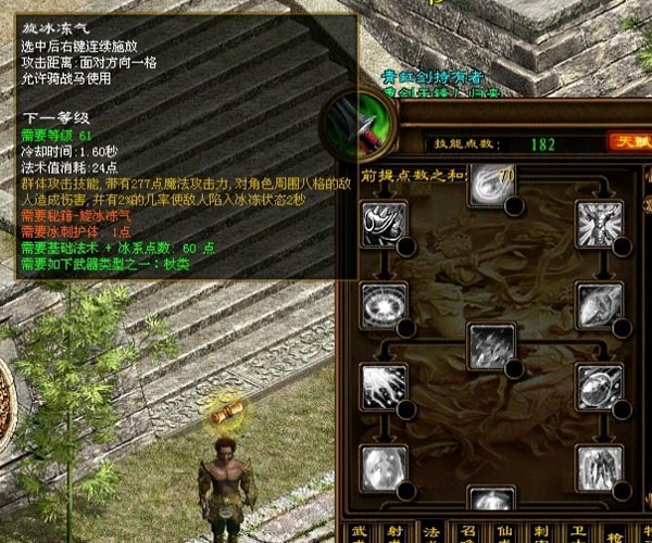 “旋冰冻气”是法术系唯一一个近程魔法群攻技能,对角色周围八格的敌人造成伤害,并有2%几率使敌人陷入冰冻状态2秒。该技能冷却时间为1.60秒,只有持法杖的时候才可以正常释放。