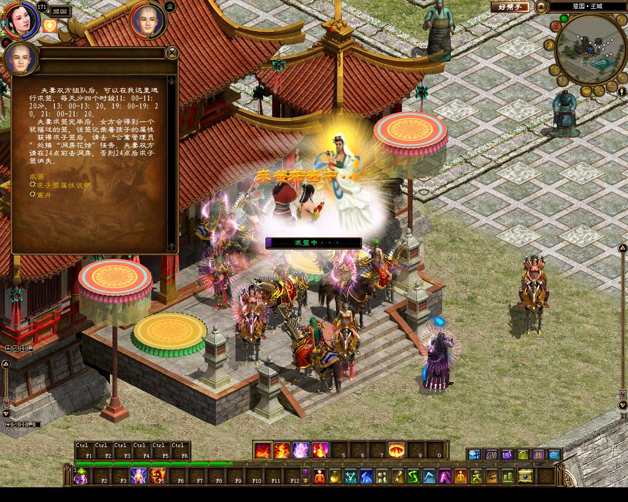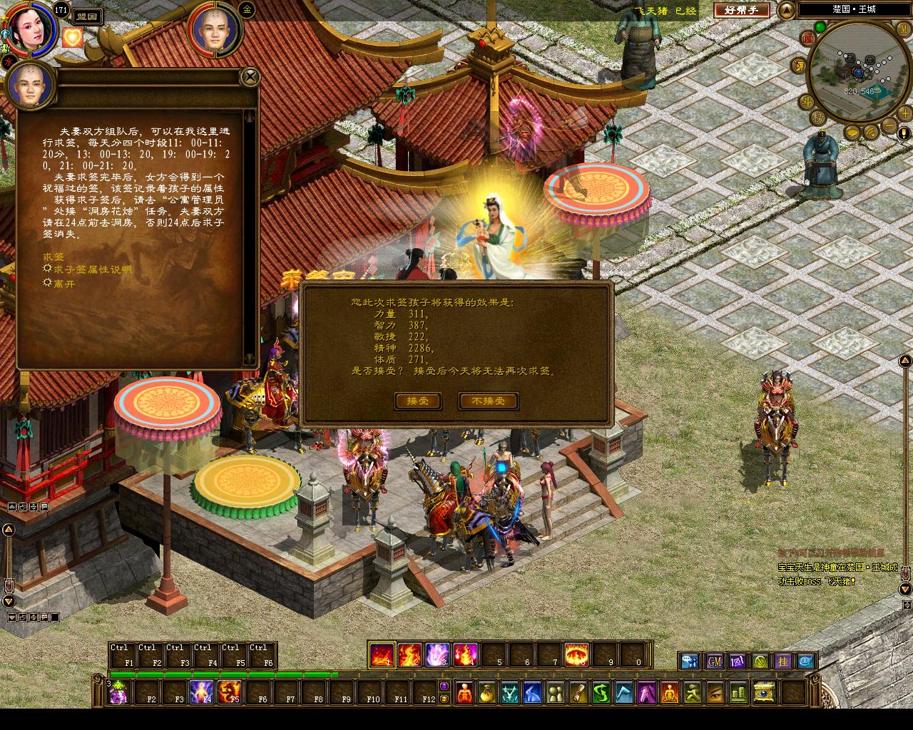 观音庙位于王城(822.551)附近,每天只有3个时间段可以求签(13:00-13:20,19:00-19:20,21:00-21:20),求签时可邀请好友来观礼、祝福,前来祝福的好友越多,孩子的属性越高。