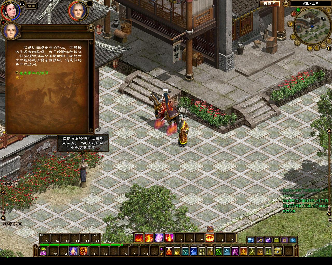 “观音送子”任务需前往3个非盟国王城,访问NPC和尚(770,531),访问完后回到世外桃源NPC管理员处进行下一任务。
